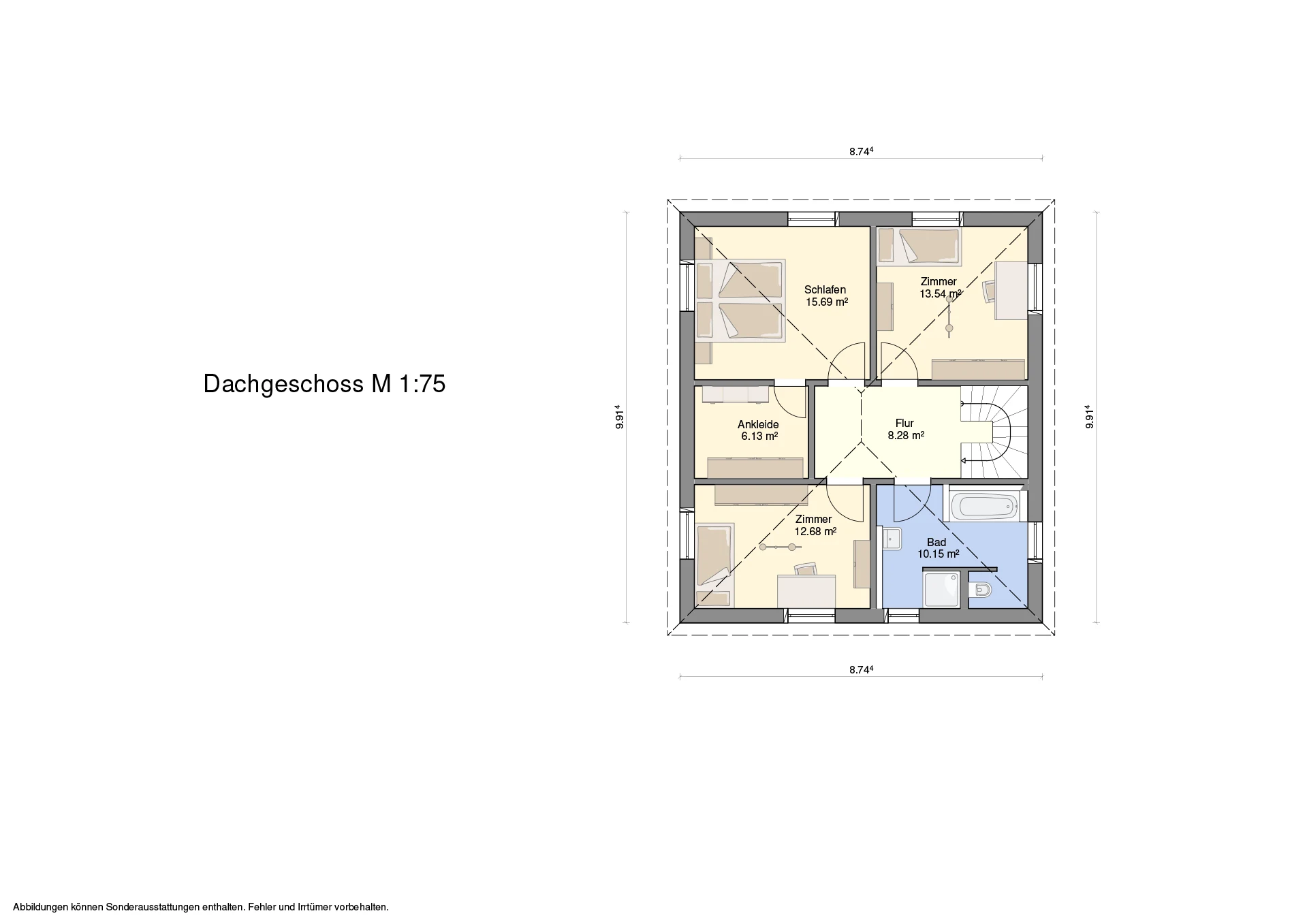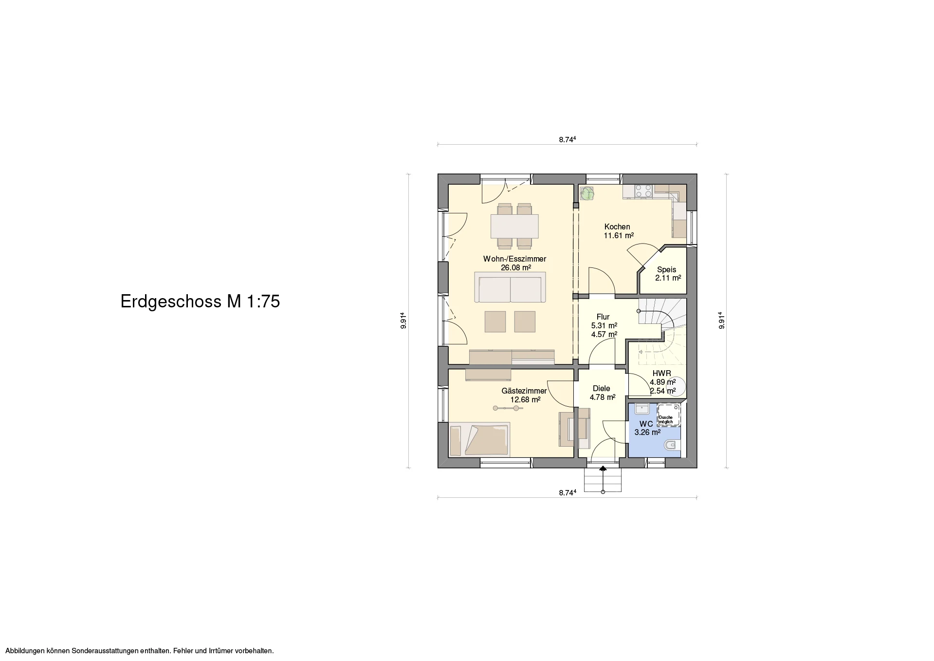 Hinweis zu Abbildungen und Flächen: Die gezeigten Abbildungen können Sonderausstattungen enthalten, die nicht im Standardleistungsumfang inbegriffen sind (z.B. Garagen, Anbauten, Carports, spezielle Fassadengestaltungen). Alle Flächenangaben sind Circa-Werte. Maßgeblich für die Ausführung und den Leistungsumfang ist ausschließlich die jeweils gültige Bau- und Leistungsbeschreibung (BLB) der Ü-Haus.de GmbH.