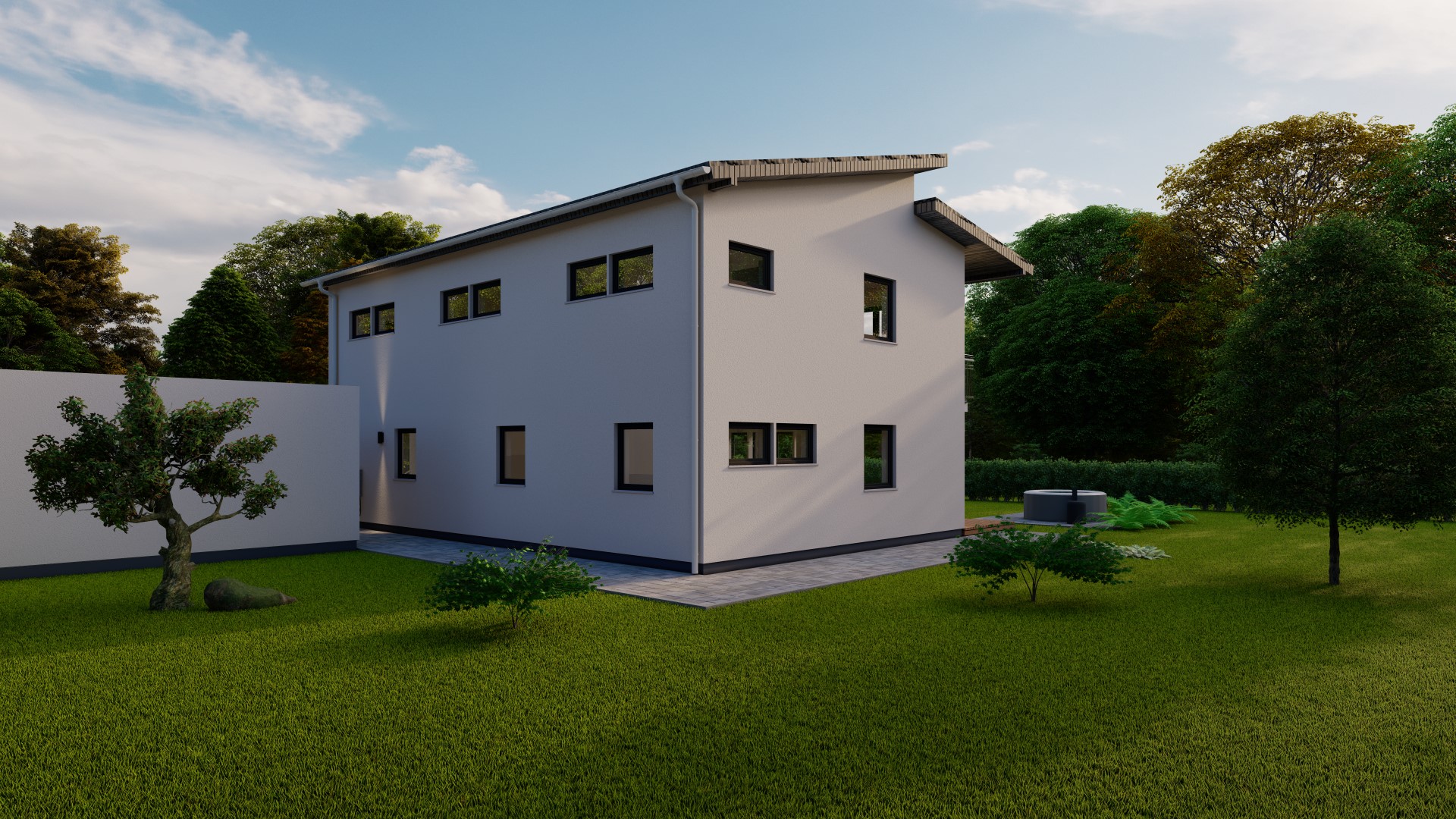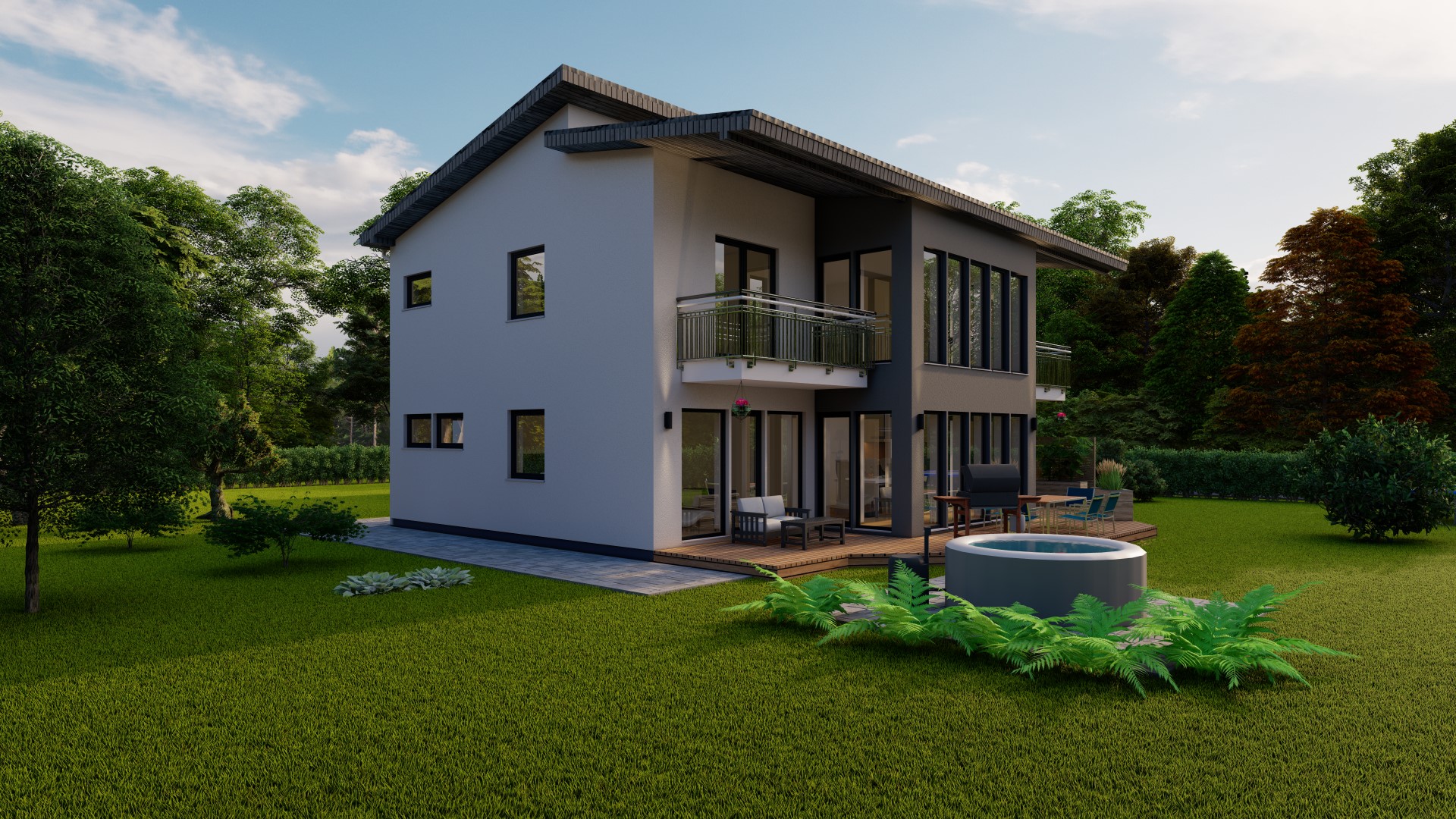Hinweis zu Abbildungen und Flächen: Die gezeigten Abbildungen können Sonderausstattungen enthalten, die nicht im Standardleistungsumfang inbegriffen sind (z.B. Garagen, Anbauten, Carports, spezielle Fassadengestaltungen). Alle Flächenangaben sind Circa-Werte. Maßgeblich für die Ausführung und den Leistungsumfang ist ausschließlich die jeweils gültige Bau- und Leistungsbeschreibung (BLB) der Ü-Haus.de GmbH.