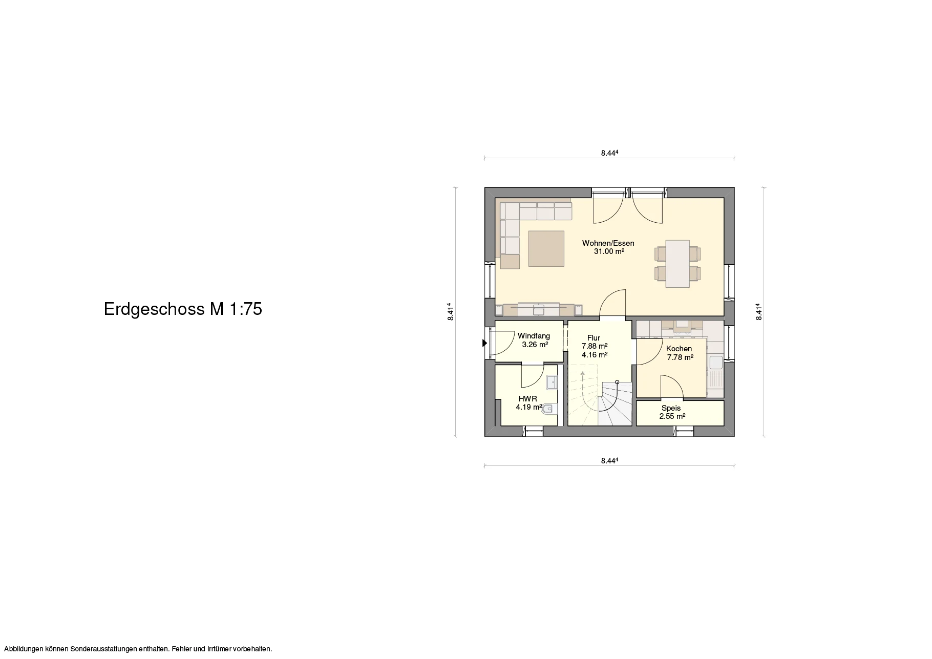 Hinweis zu Abbildungen und Flächen: Die gezeigten Abbildungen können Sonderausstattungen enthalten, die nicht im Standardleistungsumfang inbegriffen sind (z.B. Garagen, Anbauten, Carports, spezielle Fassadengestaltungen). Alle Flächenangaben sind Circa-Werte. Maßgeblich für die Ausführung und den Leistungsumfang ist ausschließlich die jeweils gültige Bau- und Leistungsbeschreibung (BLB) der Ü-Haus.de GmbH.