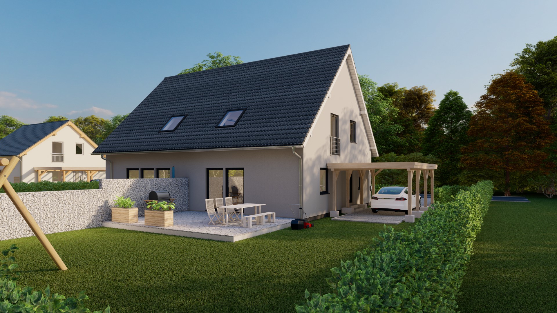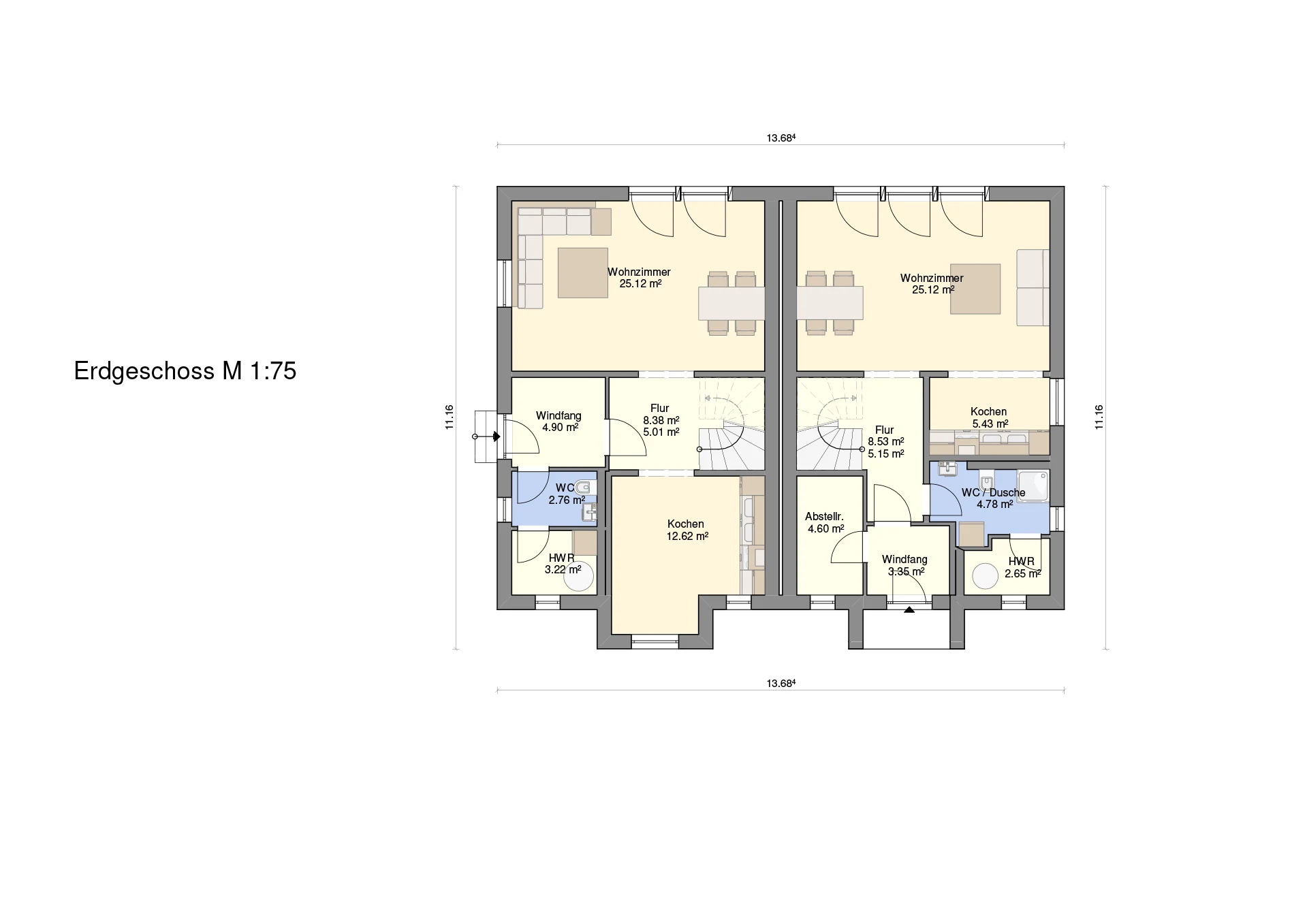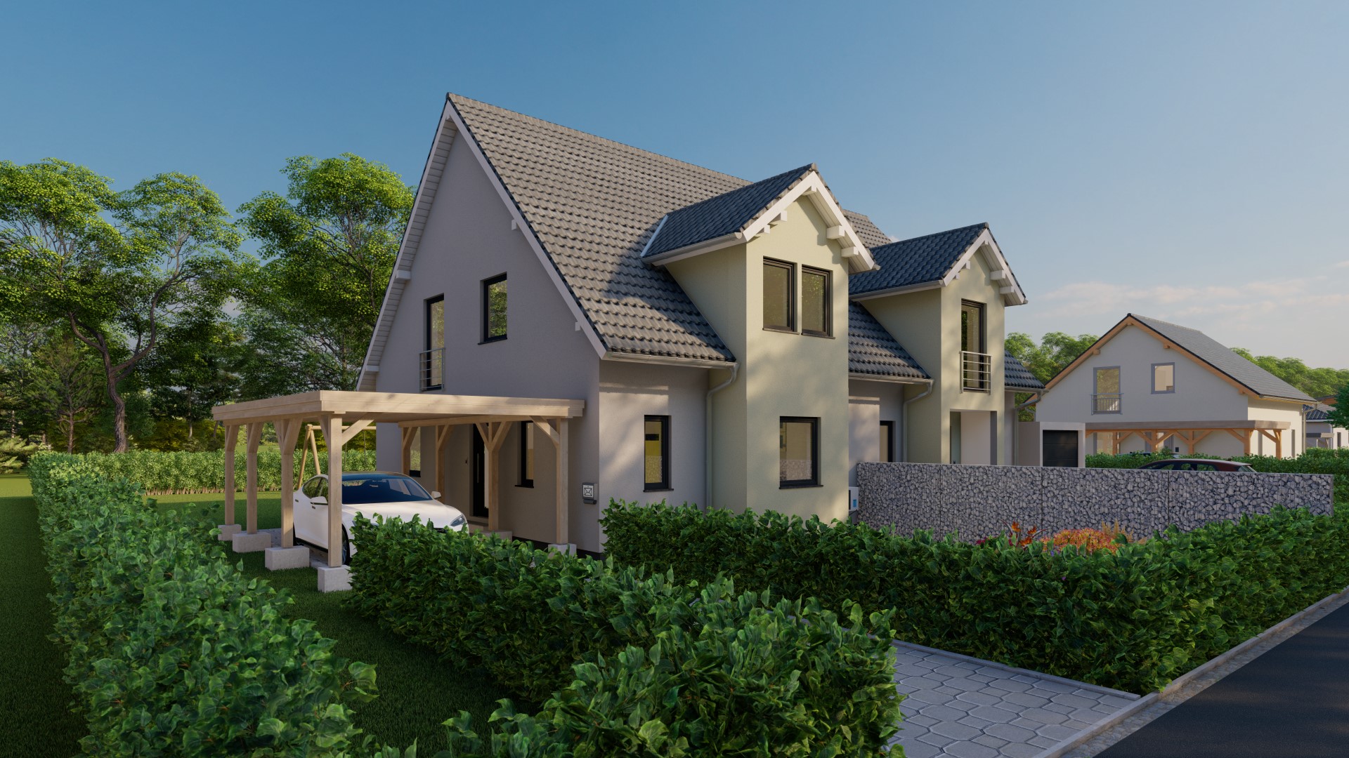 Hinweis zu Abbildungen und Flächen: Die gezeigten Abbildungen können Sonderausstattungen enthalten, die nicht im Standardleistungsumfang inbegriffen sind (z.B. Garagen, Anbauten, Carports, spezielle Fassadengestaltungen). Alle Flächenangaben sind Circa-Werte. Maßgeblich für die Ausführung und den Leistungsumfang ist ausschließlich die jeweils gültige Bau- und Leistungsbeschreibung (BLB) der Ü-Haus.de GmbH.