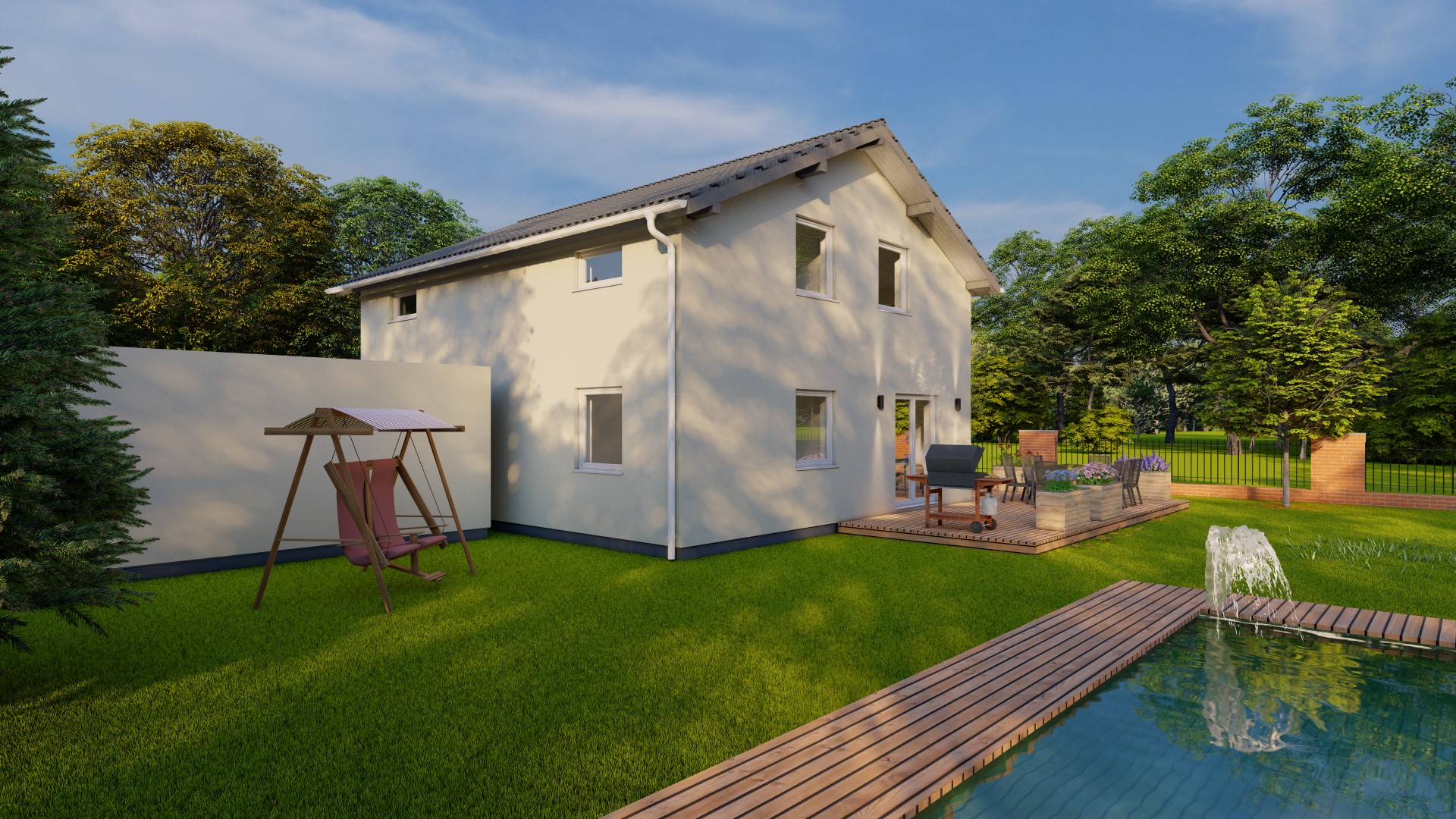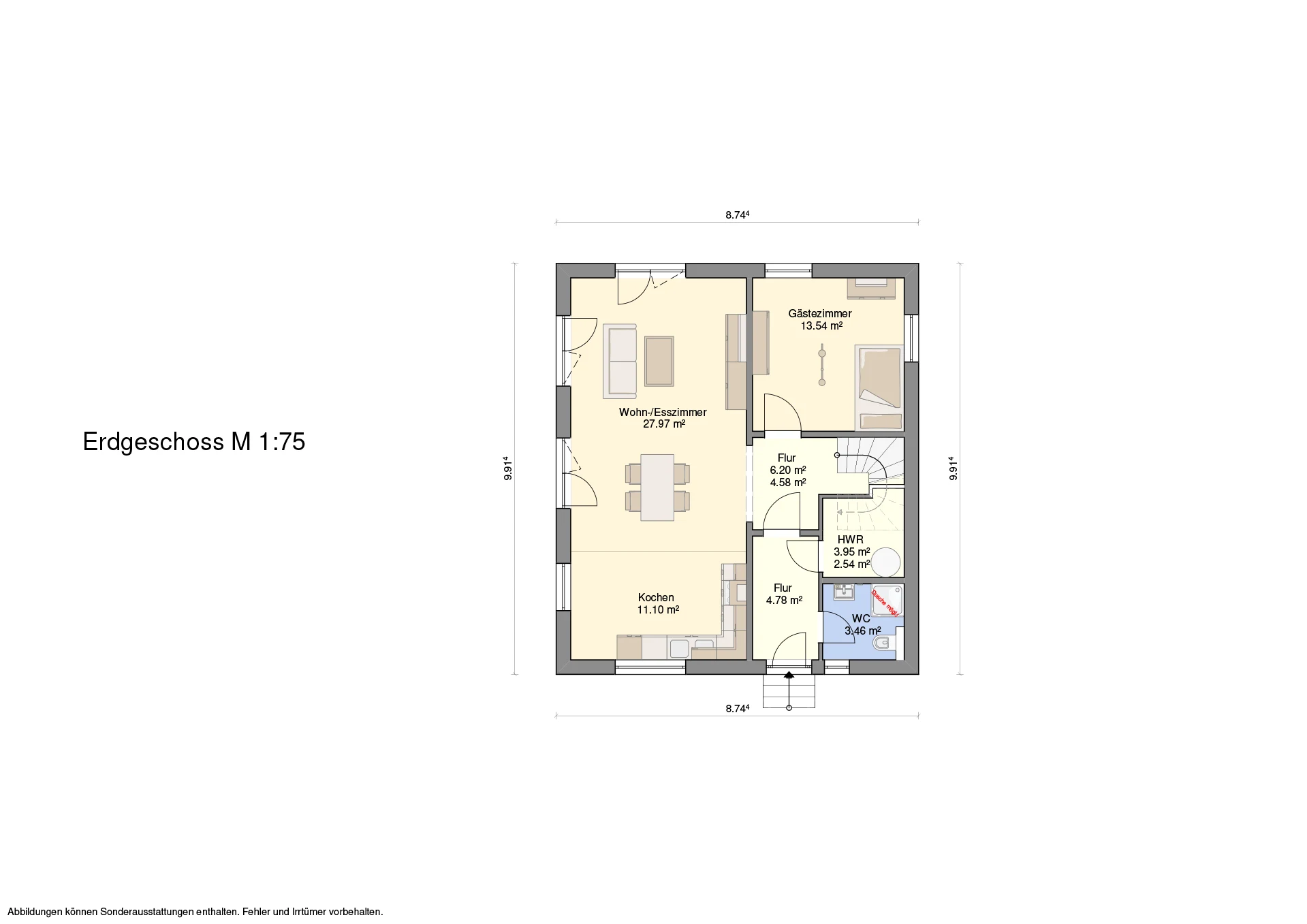 Hinweis zu Abbildungen und Flächen: Die gezeigten Abbildungen können Sonderausstattungen enthalten, die nicht im Standardleistungsumfang inbegriffen sind (z.B. Garagen, Anbauten, Carports, spezielle Fassadengestaltungen). Alle Flächenangaben sind Circa-Werte. Maßgeblich für die Ausführung und den Leistungsumfang ist ausschließlich die jeweils gültige Bau- und Leistungsbeschreibung (BLB) der Ü-Haus.de GmbH.