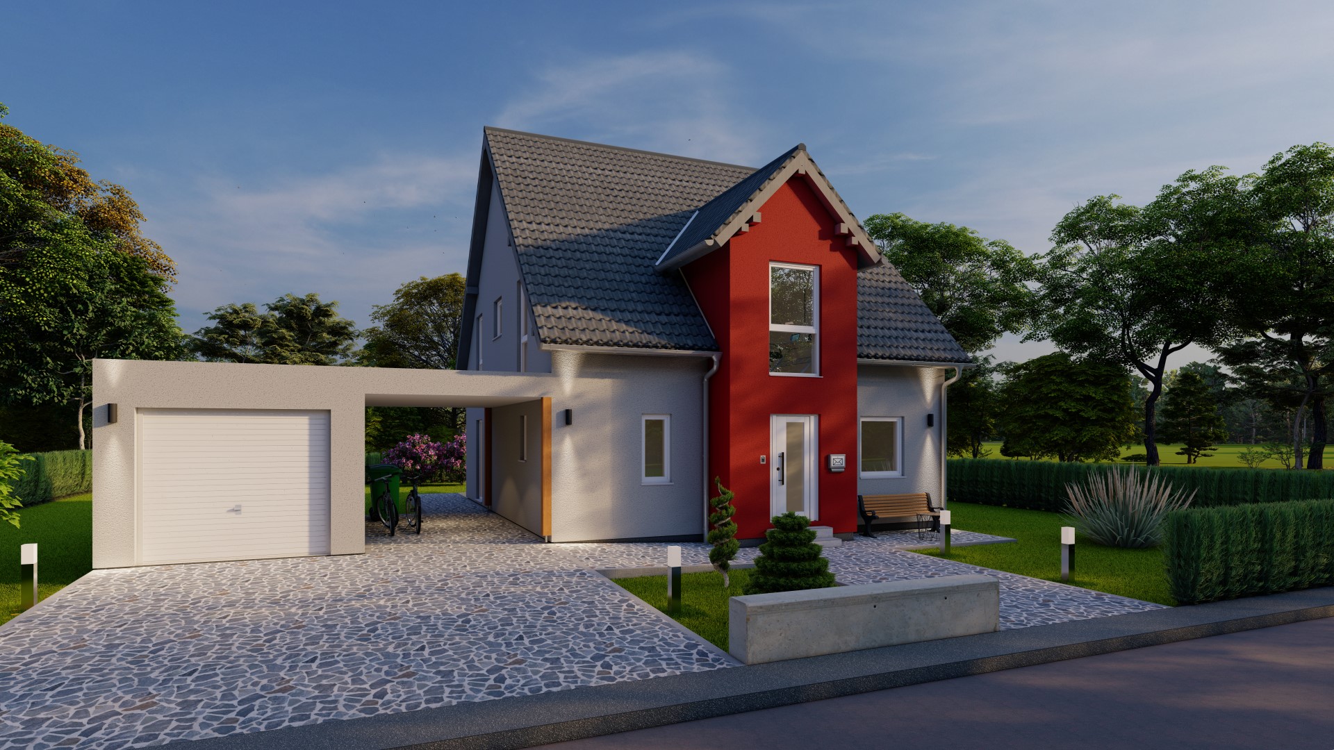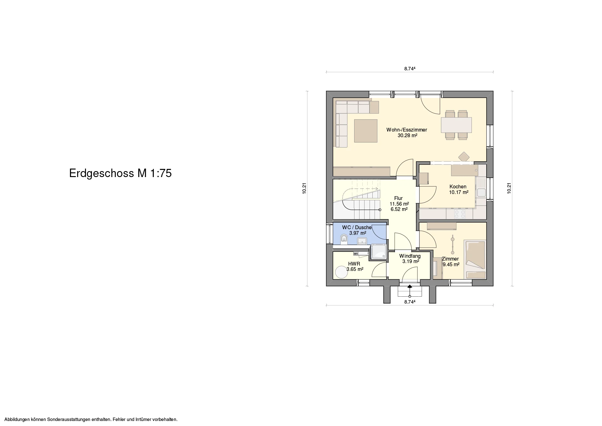 Hinweis zu Abbildungen und Flächen: Die gezeigten Abbildungen können Sonderausstattungen enthalten, die nicht im Standardleistungsumfang inbegriffen sind (z.B. Garagen, Anbauten, Carports, spezielle Fassadengestaltungen). Alle Flächenangaben sind Circa-Werte. Maßgeblich für die Ausführung und den Leistungsumfang ist ausschließlich die jeweils gültige Bau- und Leistungsbeschreibung (BLB) der Ü-Haus.de GmbH.