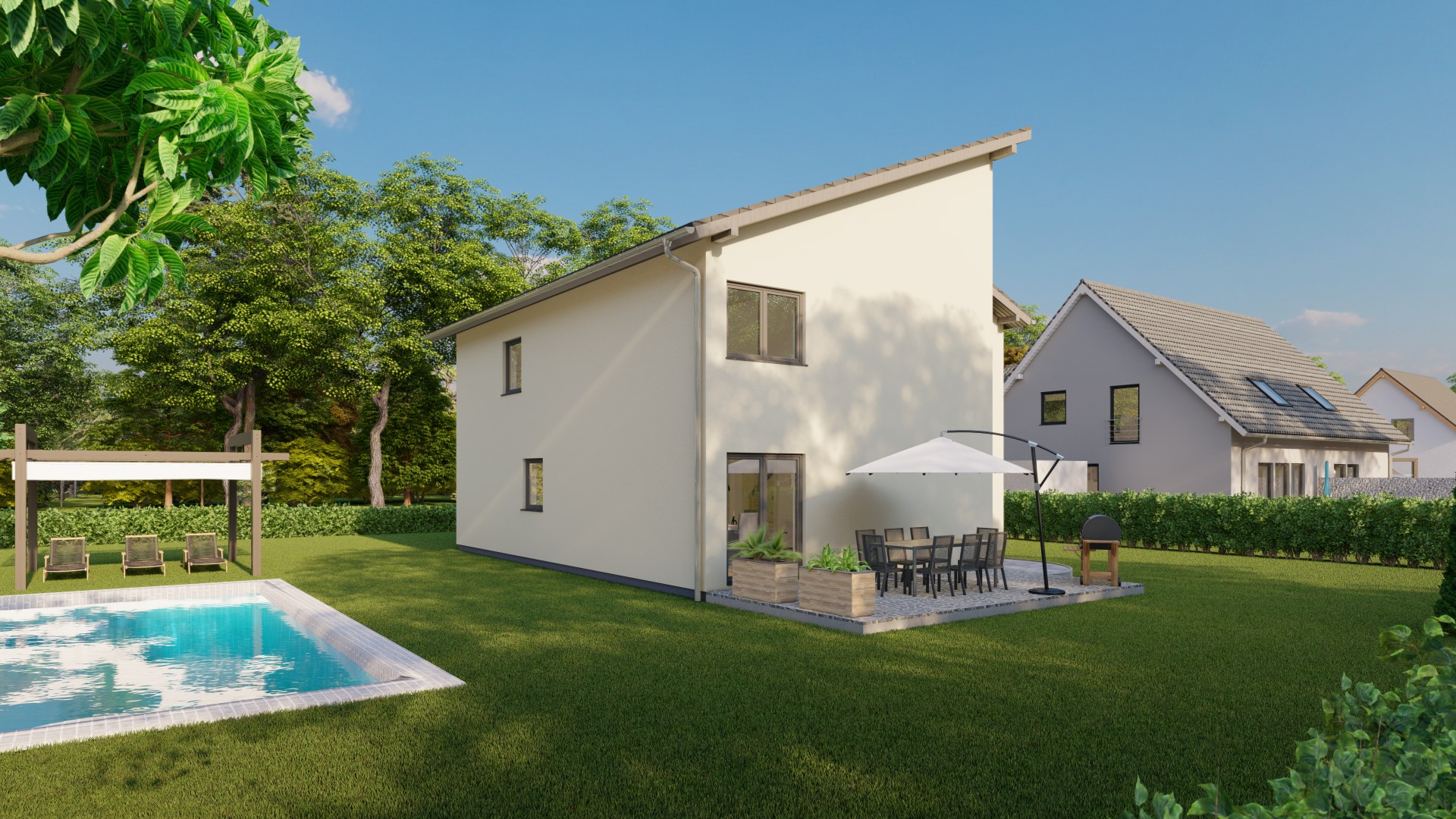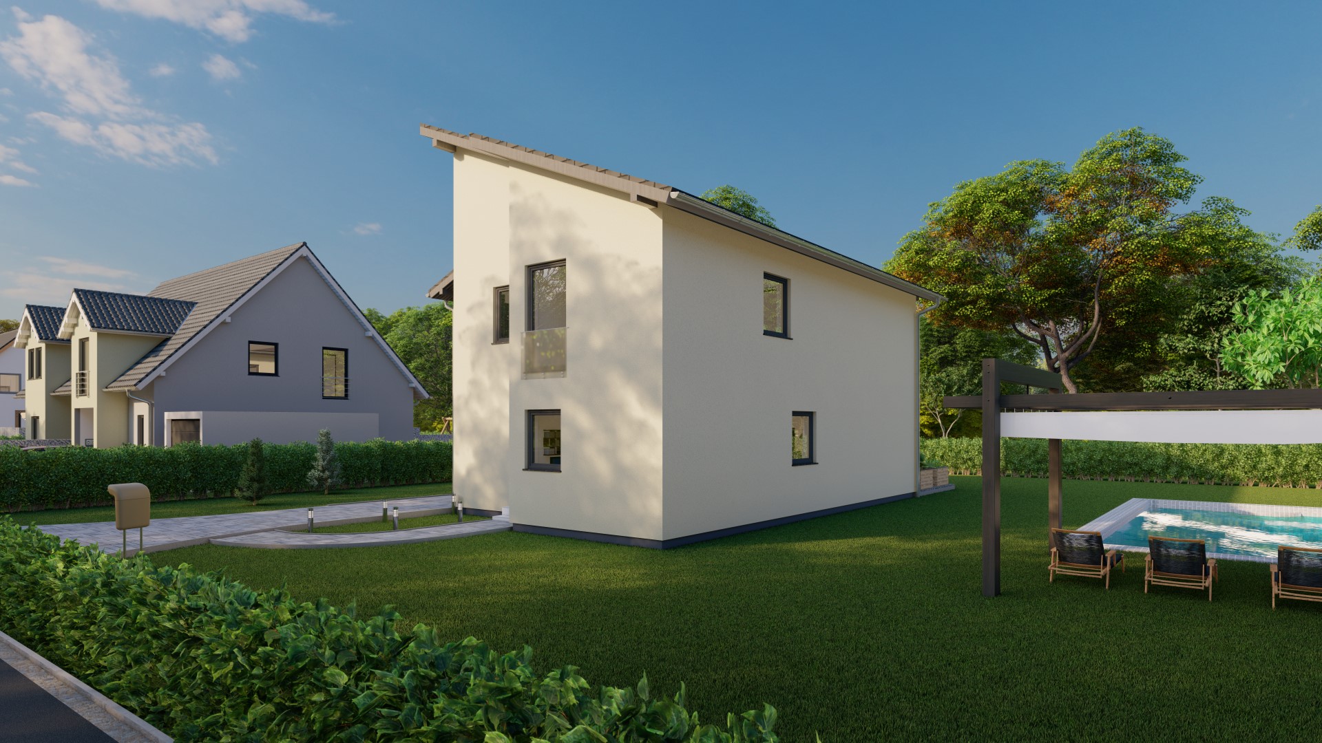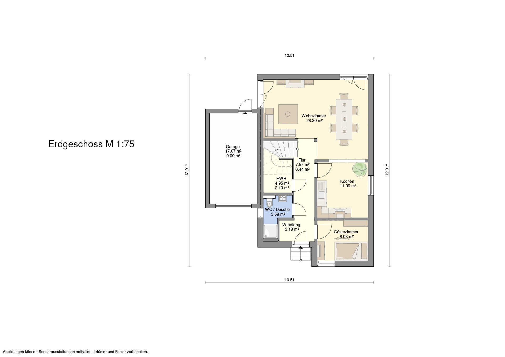 Hinweis zu Abbildungen und Flächen: Die gezeigten Abbildungen können Sonderausstattungen enthalten, die nicht im Standardleistungsumfang inbegriffen sind (z.B. Garagen, Anbauten, Carports, spezielle Fassadengestaltungen). Alle Flächenangaben sind Circa-Werte. Maßgeblich für die Ausführung und den Leistungsumfang ist ausschließlich die jeweils gültige Bau- und Leistungsbeschreibung (BLB) der Ü-Haus.de GmbH.