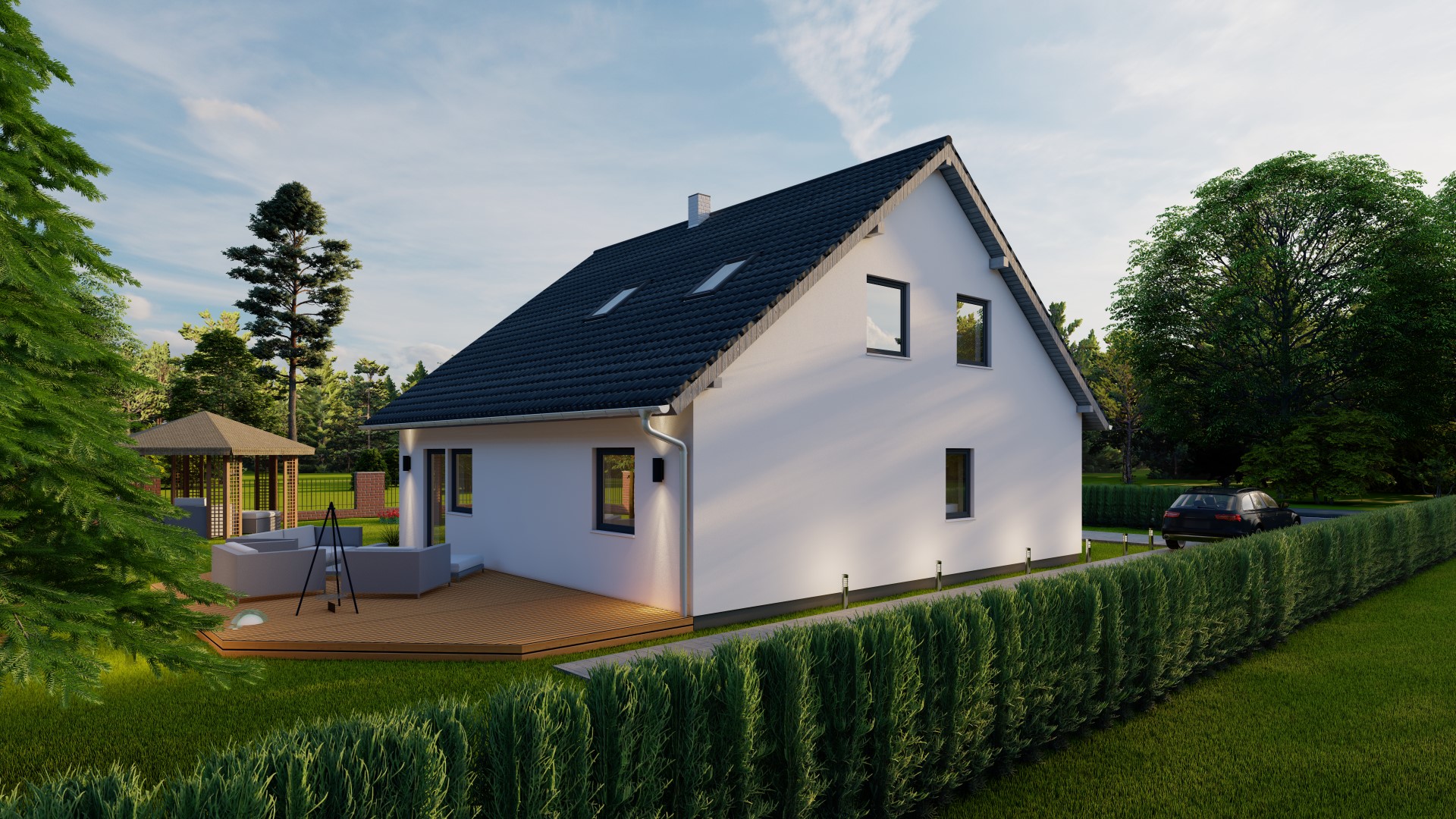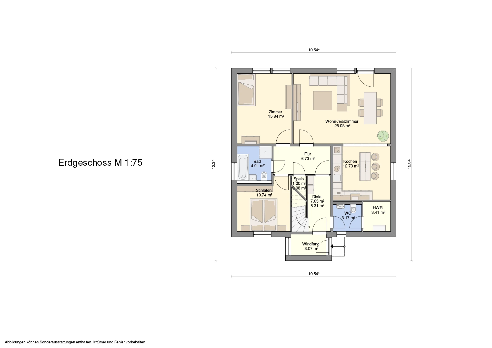 Hinweis zu Abbildungen und Flächen: Die gezeigten Abbildungen können Sonderausstattungen enthalten, die nicht im Standardleistungsumfang inbegriffen sind (z.B. Garagen, Anbauten, Carports, spezielle Fassadengestaltungen). Alle Flächenangaben sind Circa-Werte. Maßgeblich für die Ausführung und den Leistungsumfang ist ausschließlich die jeweils gültige Bau- und Leistungsbeschreibung (BLB) der Ü-Haus.de GmbH.