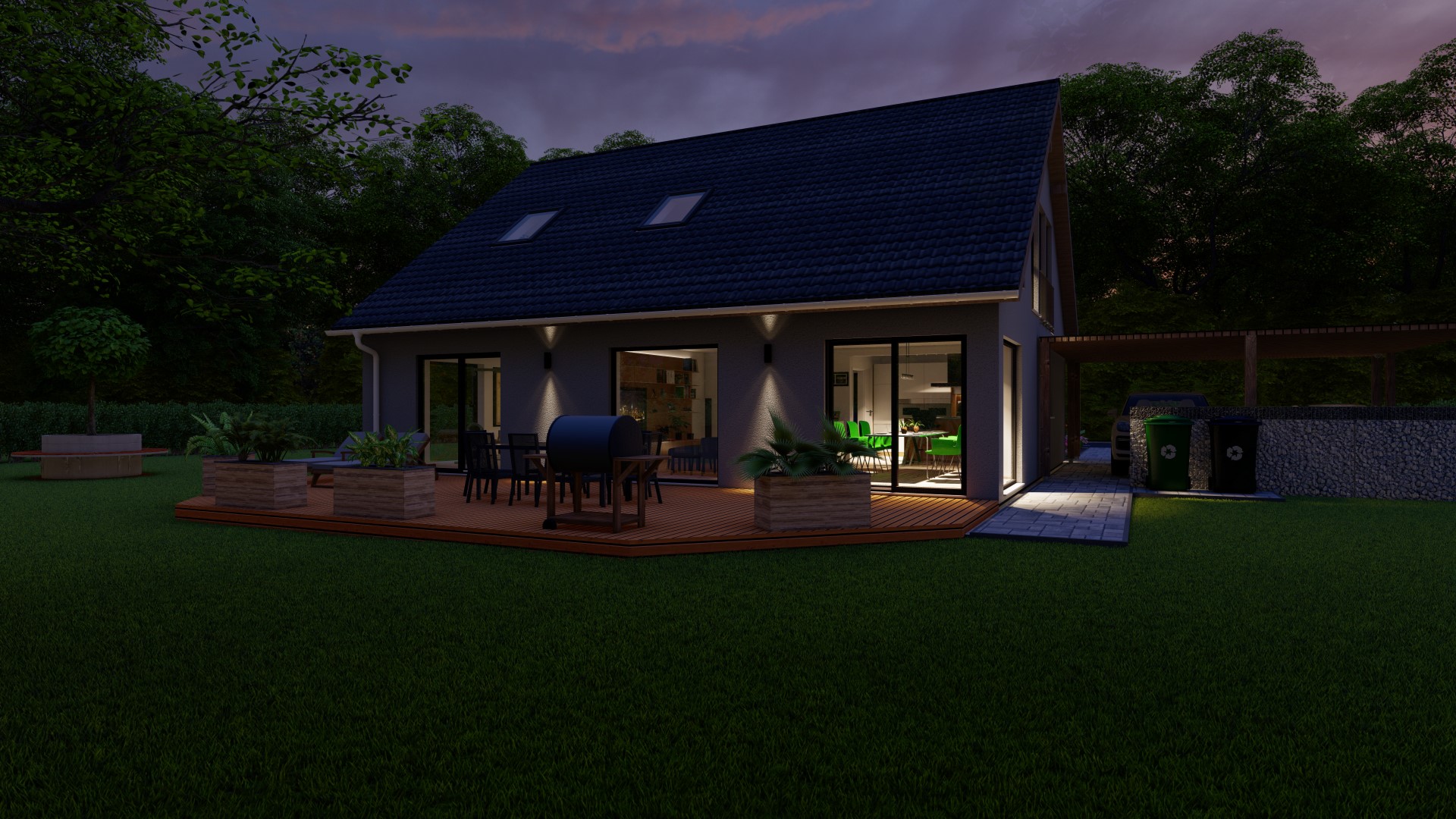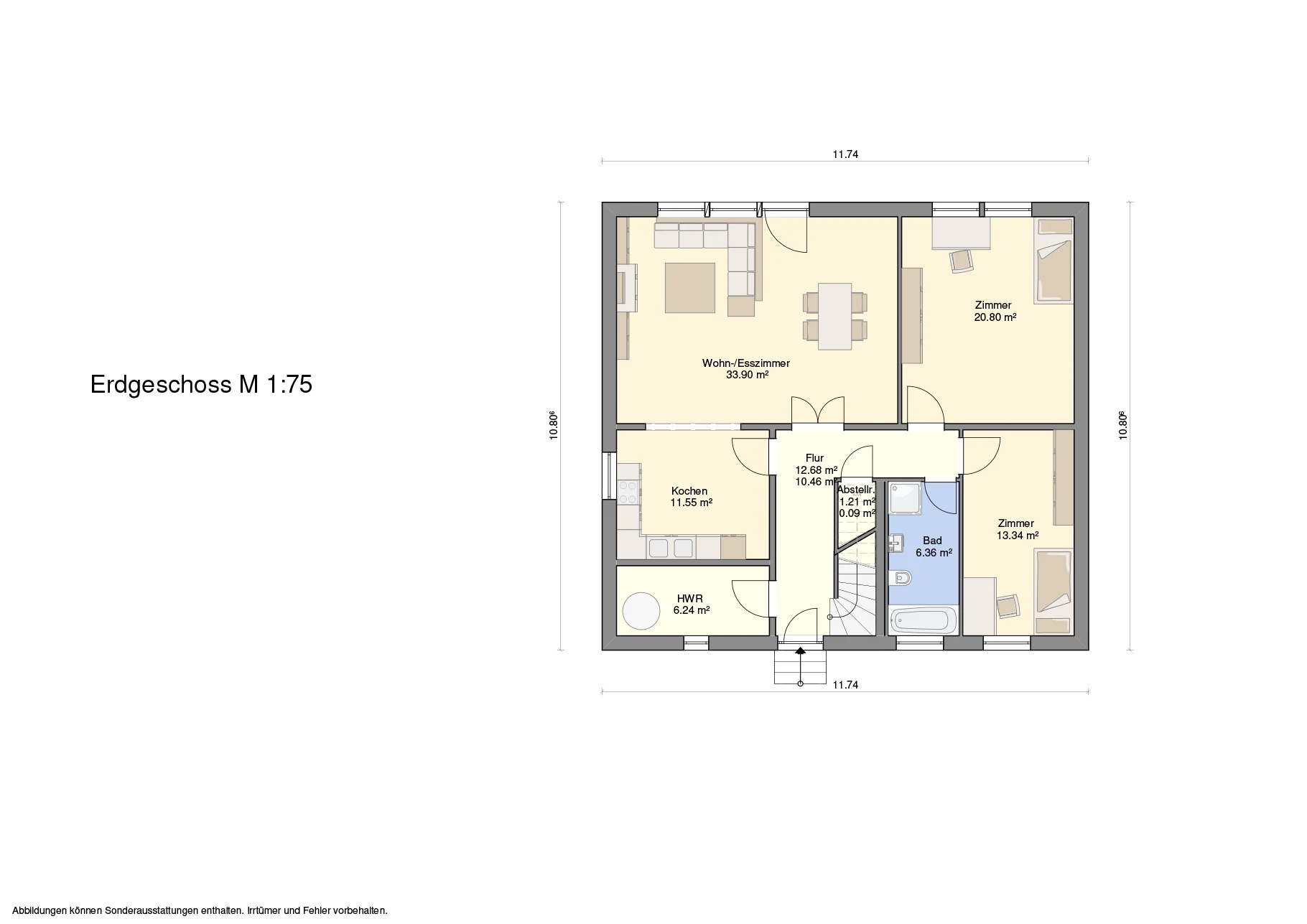 Hinweis zu Abbildungen und Flächen: Die gezeigten Abbildungen können Sonderausstattungen enthalten, die nicht im Standardleistungsumfang inbegriffen sind (z.B. Garagen, Anbauten, Carports, spezielle Fassadengestaltungen). Alle Flächenangaben sind Circa-Werte. Maßgeblich für die Ausführung und den Leistungsumfang ist ausschließlich die jeweils gültige Bau- und Leistungsbeschreibung (BLB) der Ü-Haus.de GmbH.